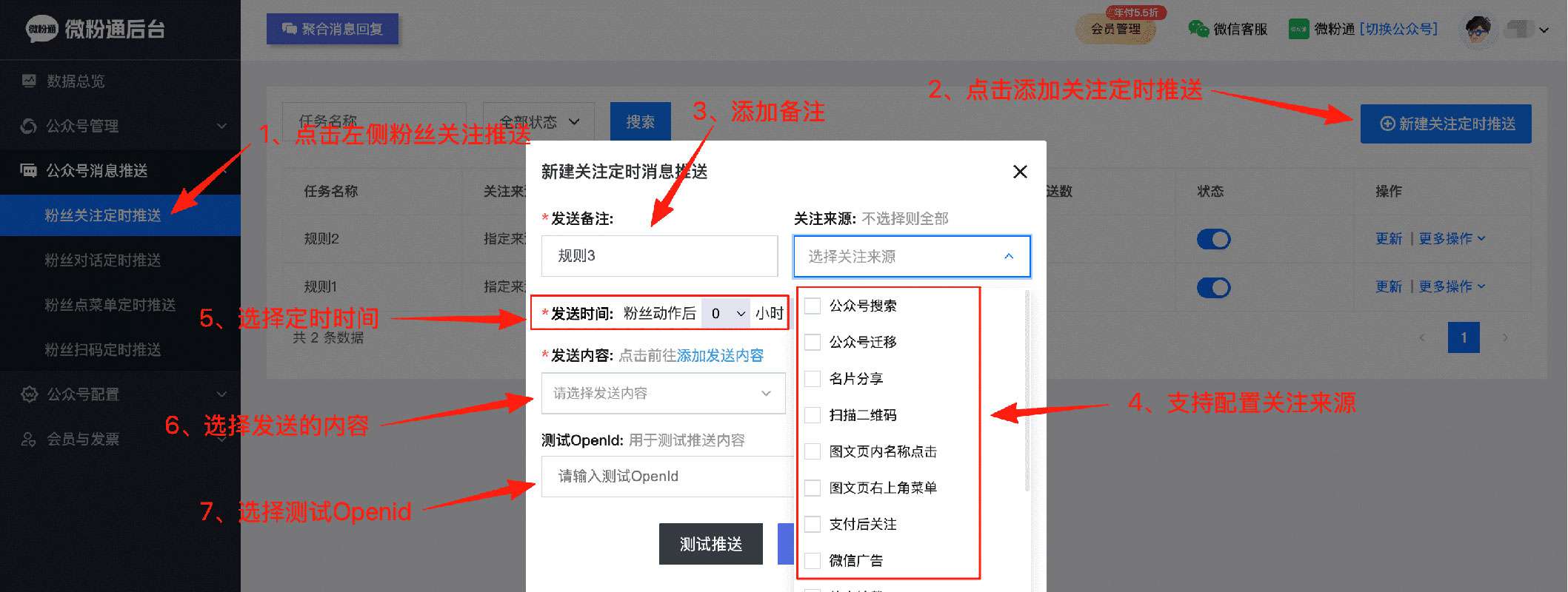 - 4、选择关注来源(可不配置) - 延迟发送时间 - 配置发送内容 - 配置测试OpenId(如果需要的话) - 完成添加;