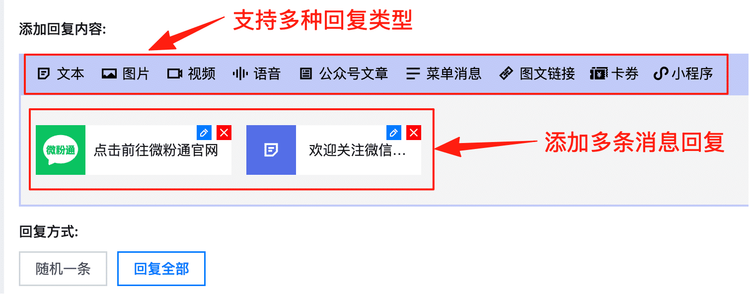 我们可以添加多种回复类型以及配置回复多条消息;您直接配置文本、图片、视频、语言、公众号文章、菜单消息、图文链接、卡券、小程序等即可。